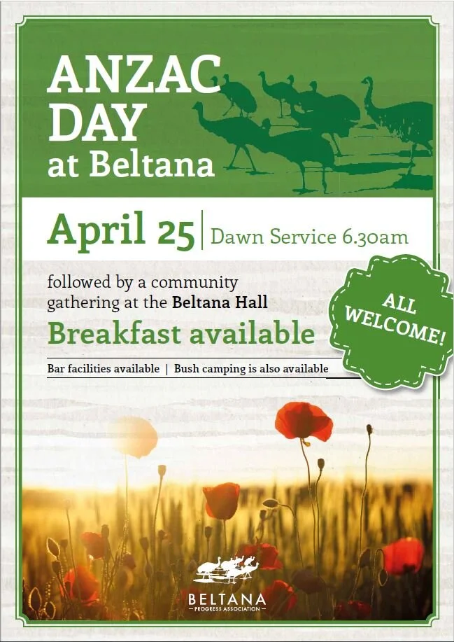Beltana is once again hosting our annual ANZAC Day service and breakfast with entertainment provided by the wonderful John O’Dea. We hope to see you there.